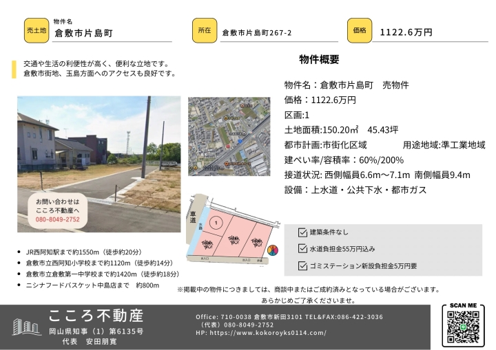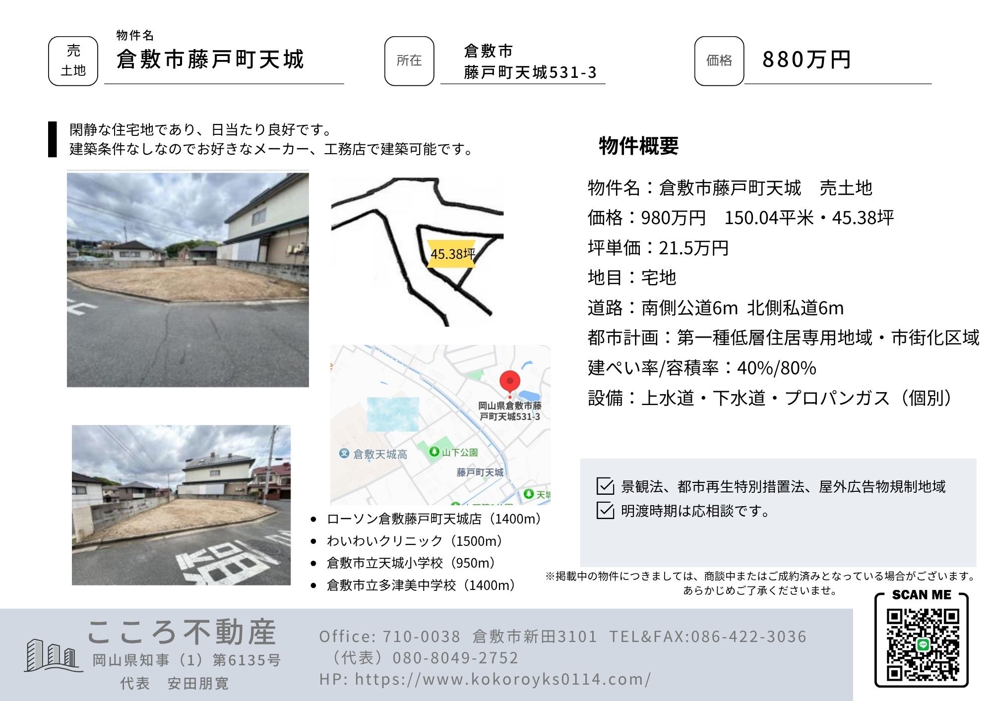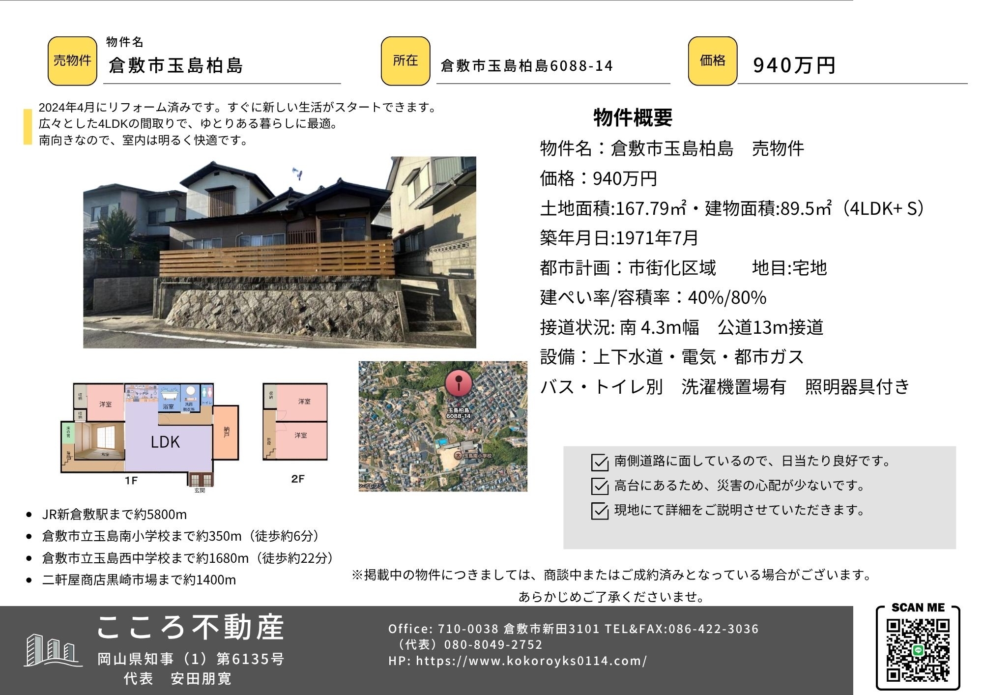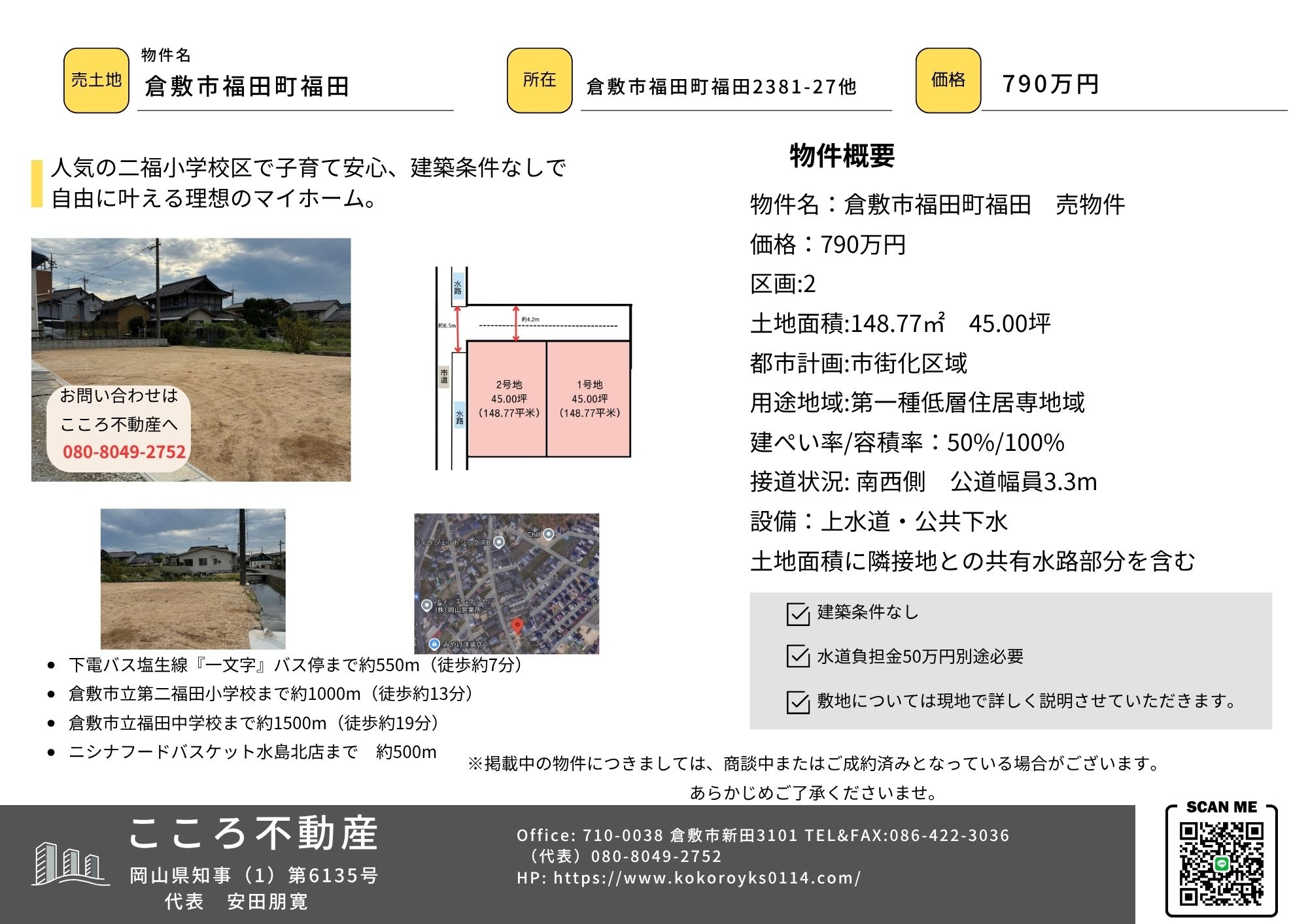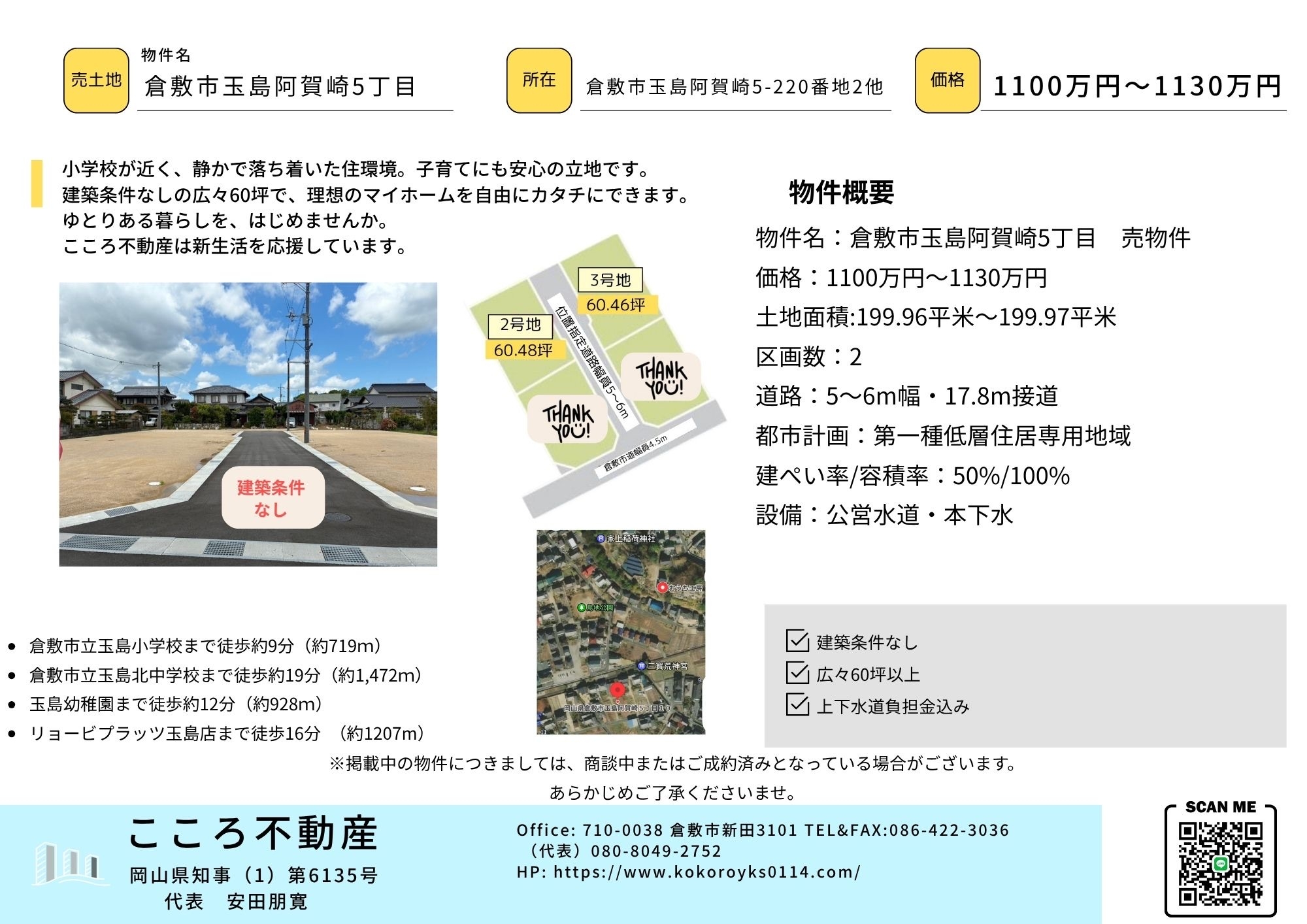 - こんにちは。こころ不動産です。 いつもホームページご覧頂きありがとうございます。こころ不動産では、下記エリアで販売活動中です。 「いまは検討段階…」という方も、どうぞ気兼ねなくご相談ください。価格のご相談や、弊社の仲介手数料についての交渉も柔軟に承ります。 【倉敷市】 新田(/玉島上成/西阿知町西原/玉島柏島/福田町福田/福島/玉島阿賀崎/藤戸町天城/児島上の町/上東/中畝5丁目/吉岡/東塚/十日市 【早島町】 早島/前潟 【岡山市】 東区松新町/北区建部町/南区植松 詳細資料のご送付、周辺環境や資金計画のご説明、内見の調整まで丁寧にサポートいたします。 「エリア名+見学希望」とメッセージをお送りいただければ、スムーズにご案内できます。お気軽にお問い合わせください。