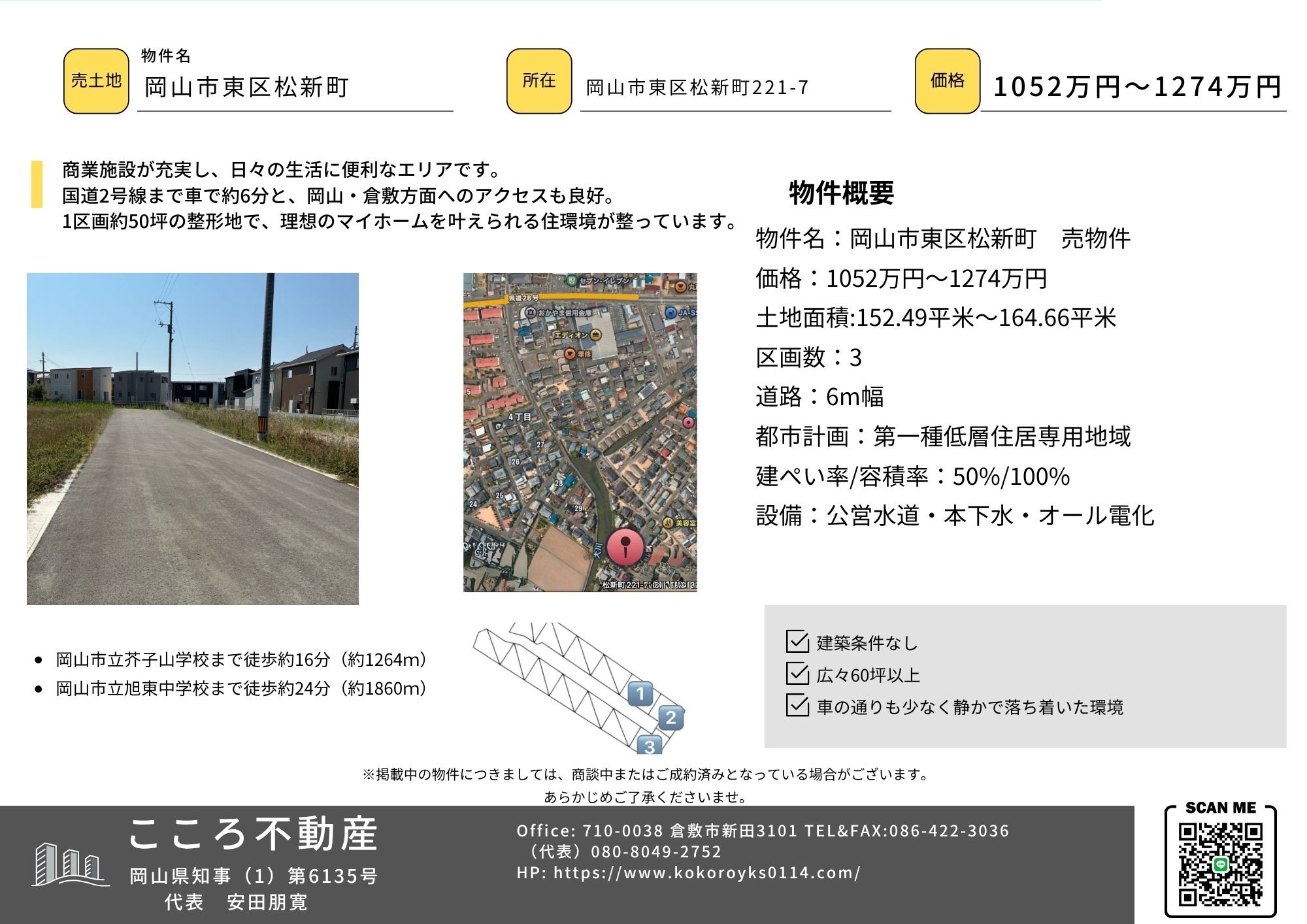 - こんにちは。こころ不動産です。 こころ不動産は、岡山県内の新規不動産情報に強みを持っています。 現在掲載している物件だけでなく、今後分譲予定の物件や未公開の情報についても、個別にご案内いたします。 ご相談は「条件やご予算を聞いてみたい」「このエリアで探している」といった小さなことからで大丈夫です。 建売や中古戸建の見学・資料請求も「とりあえず見てみたい」という段階でかまいません。購入予定がなくても、どうぞお気軽にお問い合わせください。