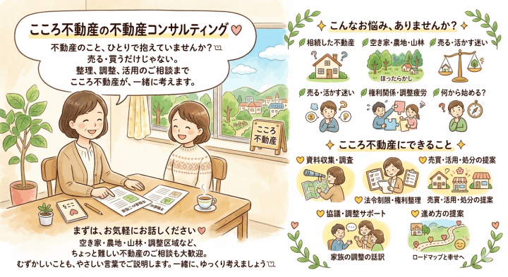 こころ不動産の不動産コンサルティング♡ 不動産のこと、ひとりで抱えていませんか?𓂃 売る・買うだけじゃない。 整理、調整、活用のご相談まで こころ不動産が、一緒に考えます。 ✦ こんなお悩み、ありませんか? 🌿 相続した不動産、どうしよう… 🌿 空き家・農地・山林、ほったらかしにしてる 🌿 売るべきか、活かすべきか、迷っている 🌿 権利関係や関係者の調整、疲れてきた 🌿 そもそも、何から始めればいいの? ✦ こころ不動産にできること 💛 資料収集・調査・現地確認 💛 法令上の制限や権利関係の整理 💛 売買・借地・活用・処分の方向性のご提案 💛 関係者との協議・調整のサポート 💛 あなたに合った進め方のご提案 まずは、お気軽にお話しください ♡ 空き家・農地・山林・調整区域など、 ちょっと難しい不動産のご相談も大歓迎。むずかしいことも、やさしい言葉でご説明します。一緒に、ゆっくり考えましょう。