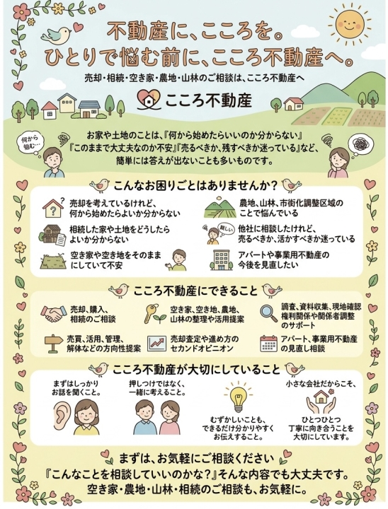 - こんにちは。こころ不動産です。 田んぼ・農地のこと、 「どうしたらいいんだろう…」って、ふと立ち止まってしまう時ありませんか。 市街化区域内の農地でも、 管理のこと、これからの使い方、貸す・売るのこと… 考えるほど分からなくなるのが普通だと思います。 こころ不動産は、いきなり結論を急がずに、 いまの状況や気持ちをゆっくり伺いながら、 できることを一つずつ整理していきます。 「まだ決めてない」「何から始めるかも分からない」 そんな段階でも大丈夫です。 まずは、気軽にお声がけください。