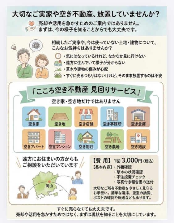 - こんにちは。こころ不動産です。 岡山市が配布を始めたエンディングノートのニュースを見て、「終末期」や「死後のこと」と聞くと、正直なところ、まだ自分ごととしては考えにくいな…という気持ちもあります。 ただ、中身を知ってみると、医療や相続の話だけでなく、自分史を振り返ったり、これからやりたいことや行ってみたい場所を書いたりできるページがあるのはいいなと感じました。 いきなり重たい内容に向き合わなくても、「これまでの自分」や「これからの自分」を整理するところから始められるなら、無理なく手に取れそうです。 住まいや暮らしも同じで、「将来どうするか」を一気に決めるのは難しくても、今の気持ちを書き留めたり、話してみたりすることが、後から大きな助けになることがあります。 エンディングノートも、人生の終わりの準備というより、「これからをどう生きたいか」を考えるための道具として、気軽に使っていいのかもしれません。 こころ不動産としても、こうした取り組みが、家族や身近な人と話すきっかけになるのは、とても大切なことだと感じました。