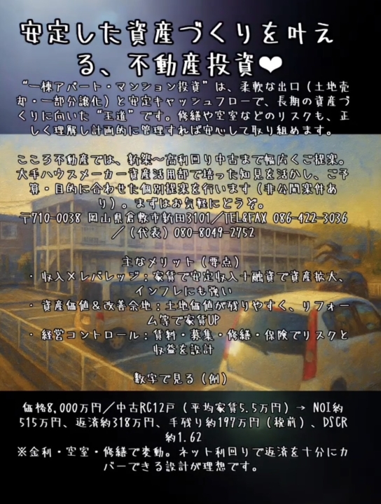 - こんばんは。こころ不動産です。 弊社は、祖父の代から受け継いだ“顔の見える不動産”を大切にしながら、売買・仲介・リフォーム・草刈りなど、暮らしに寄り添う幅広いサポートを行っています。 猛暑のなかでの物件確認をアイス休憩で乗り切ったり、岡山の銘菓「大手まんぢゅう」や「きびだんご」を紹介したりと地元の暮らしに寄り添う会社として、地域の人々との距離を縮めています。 流行や効率だけでなく、誠実さと信頼を土台にした長く続く繁栄を目指しています。 「こころ不動産」は、不動産の取引にとどまらず、暮らしや地域の魅力まで伝える“暮らしの案内人”として、倉敷の街とともに歩み続けていきます。