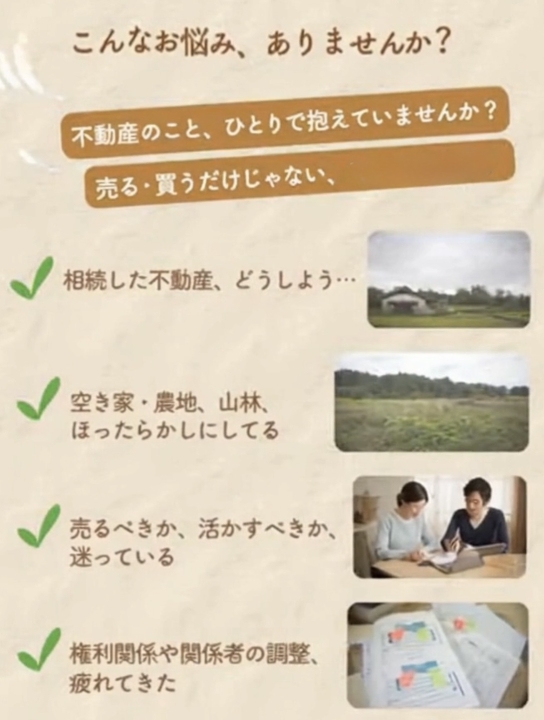 こんなお困りごとは、こころ不動産へ♡ 実は私自身も、倉敷新田に約3,000坪の農地を所有しています。 農地は市街化調整区域にあることも多く、 「これからどう管理していけばいいのかな…」 「この先どうしたらいいんだろう…」 と悩むことがたくさんあります。 そんな経験があるからこそ、 土地や不動産のことで悩まれている方のお気持ちにも、 少し近い目線で寄り添えるのではないかと思っています。 もちろん、私がお伝えできることは、 あくまでひとつの考え方です。 でも、気軽なお話の中から、 少しでも気持ちが軽くなったり、 これからの方向性が見えてきたり、 そんなきっかけになれば嬉しいです♡ よくあるお困りごと ・他社に相談したけれど、むずかしいと言われた ・古い空き家をどうしたらいいか分からない ・相続した田んぼや山林のことが気になっている ・売れるかどうか分からず、そのままになっている土地がある ・遠方に住んでいて、管理や草刈りが大変 ・解体した方がいいのか、そのままでいいのか迷っている ・何から始めたらいいのか分からない そんな時は… ひとりで悩まず、まずはお気軽にご相談ください♡ こころ不動産が、やさしくお話をお伺いします。 空き家・農地・山林・相続のご相談も、お気軽に♡ 不動産に、こころを。こころ不動産