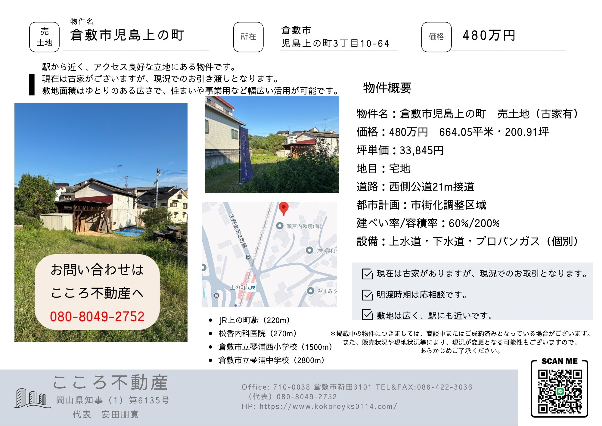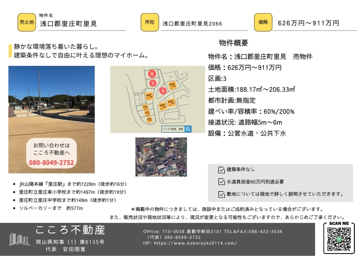 - こんにちは。こころ不動産です。 弊社は、お客様からお預かりした大切な不動産を、誠実な販売活動と管理でしっかりとサポートいたします。 自社での抱え込みをせず、スーモ、アットホーム、レインズ、住まいる岡山、各種信頼性の高いSNS での情報掲載も行っています。 検討中のお客様にアプローチするための豊富な仕組みを活用し、圧倒的な集客力のあるポータルサイトとアナログな活動を駆使して、しっかりとお客様をサポートいたします。掲載も業界トップクラスのスピードを目指しています。 また、管理につきまして現地に自ら行き、物件をより好条件で売買できるよう努めます。 ぜひ、こころ不動産にお任せください。