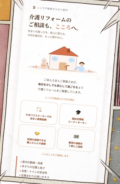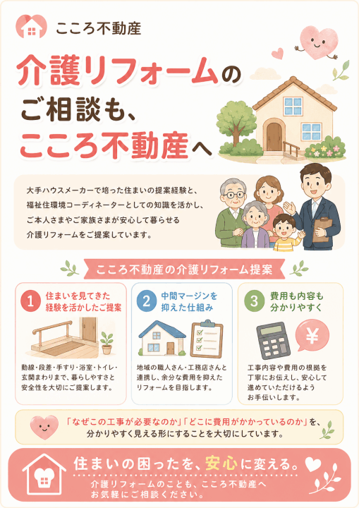 この家でずっとやさしく暮らす 高齢の方だけでの生活の中で、 「少し段差が不安になってきた」 「手すりがあれば安心できる」 「寒さをやわらげたい」 「屋根と外壁をきれいにして、住まいに安心して生活したい」 「大がかりではなくても、少し家をきれいにしたい」 そのようなお悩みをお持ちの方も多いのではないでしょうか。 こころ不動産では、住み慣れたご自宅で、これからもできるだけ安心して暮らしていただけるよう、手すりの設置や寒さ対策、ちょっとしたリフォームなど、暮らしに合わせた住まいのご提案を行っています。 社会保険労務士や福祉住環境コーディネーターの視点も活かしながら、お一人おひとりの状況に寄り添い、毎日の生活が少しでも快適になるようお手伝いいたします。 「できればこの家で、この先も暮らしたい」 そんな思いを大切にしながら、こころ不動産が住まいの面からやさしく支えてまいります。